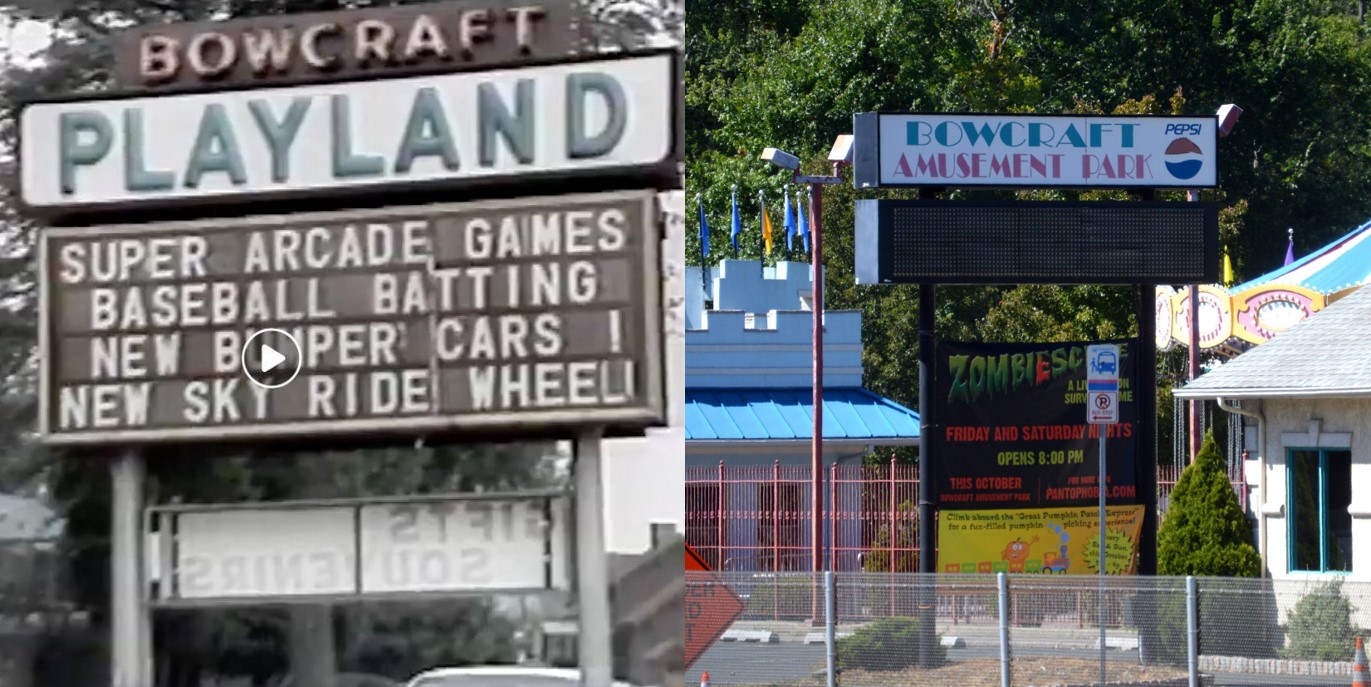 Two of the signs outside of Bowcraft, the left is probably from the 70s or 80s, the right the last sign. (Right Half of image courtesy of TapInto.net)