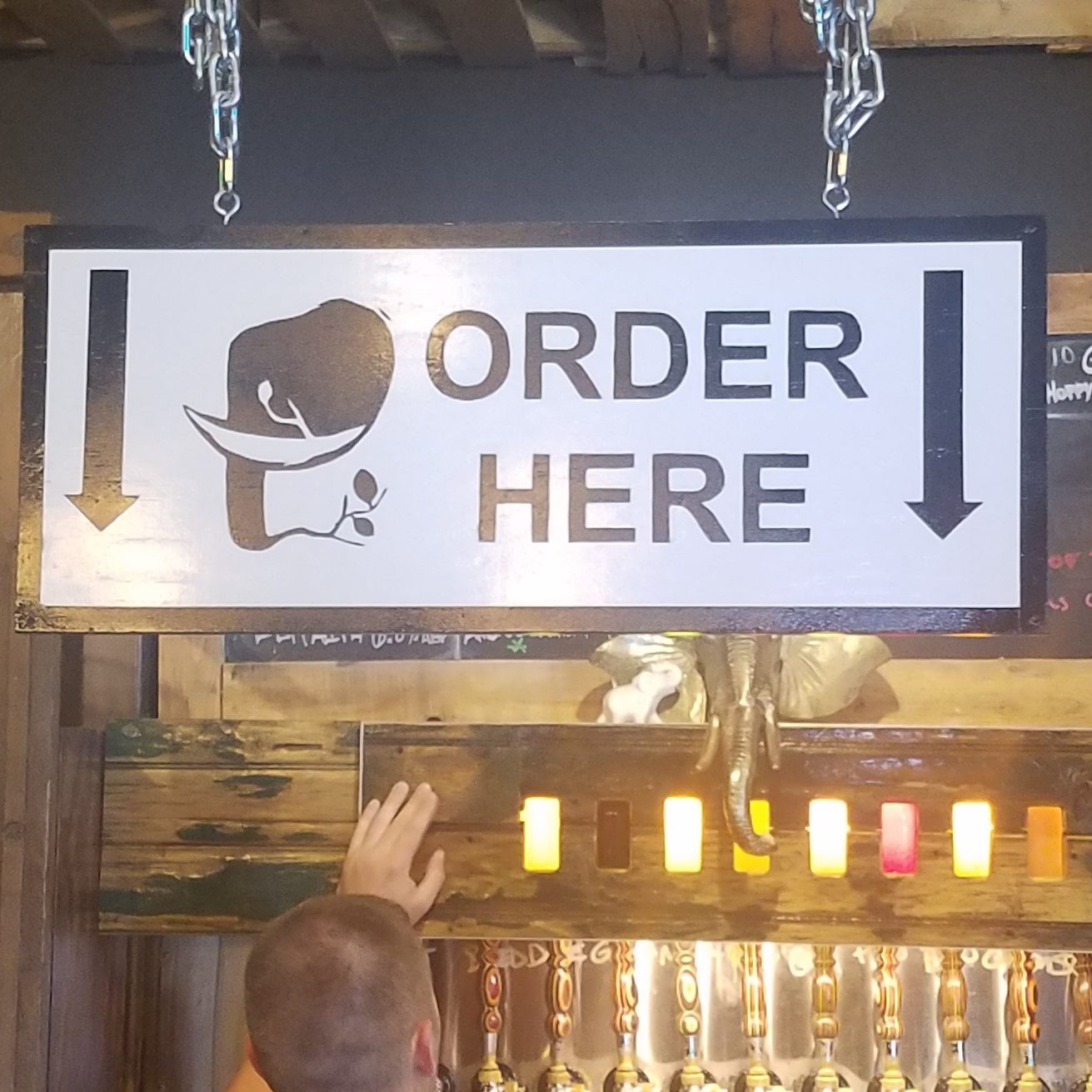 As for the brewery itself, it has a very comforting, rustic feel. Much of the seating area is made from wood reclaimed from a collapsed barn. The material, along with the lower benches around the perimeter, as well as some high tables in the middle give a mixed, yet intimate feel. The seating gives communal feel, all told. There’s an outdoor biergarten, but the first thing you see down the hall when you walk into the brewery is a lovely mural of their brewery’s logo – an elephant with two hop cones in its trunk depicted in black on off-white background that really pops.