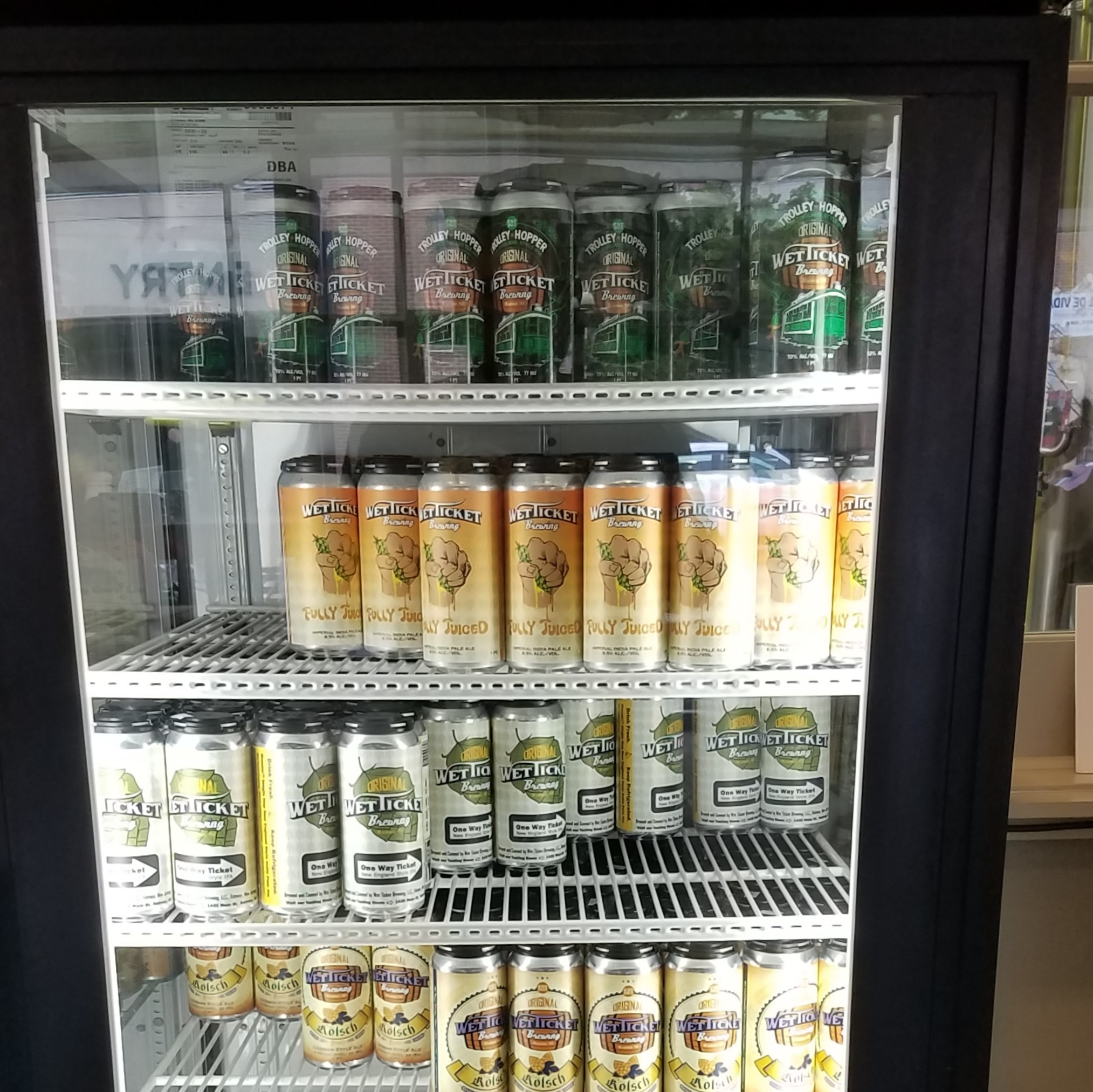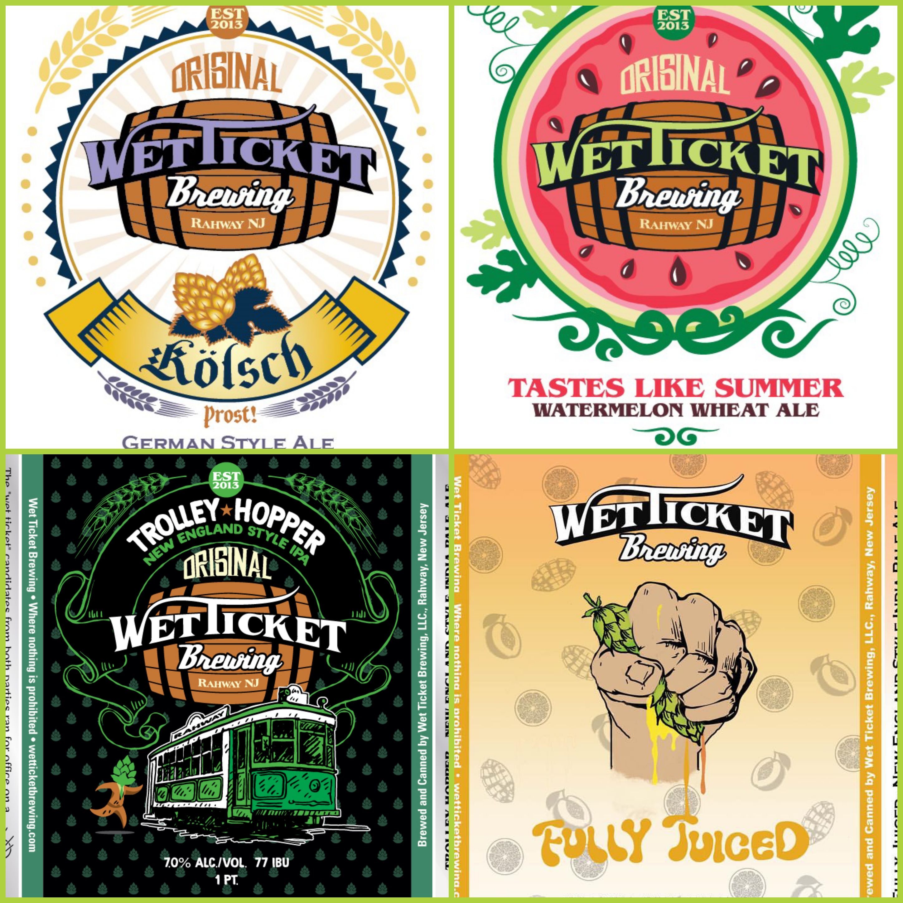 In addition to being available at local restaurants (as well as bars and stores across the northern part of NJ), Wet Ticket is active in the community. They do a regular Yoga night, Flow to Flights. They’ve led and participated in donation drives for the Rahway Food Bank as well as food and supply drives for stray cats. They are hosting a pre-party for an upcoming concert at the nearby Union County Performing Arts Center. In short, Tim, Al, and all the folks behind the scenes at Wet Ticket Brewing are helping to foster a strong sense of community along with making great beer. Their eye-catching logo was crowd sourced and later touched up by Wizdom Media, a local design firm in Rahway down the street from Wet Ticket. Wizdom Media also provided the label art for Trolley Hopper, Kolsch, Dream Ticket, and Watermelon Wheat. The great art for Fully Juiced came from a family member, while the can art for One Way Ticket and Rahway or the Highway came from a former Wet Ticket brewery worker, who now works for Boston Beer/Samuel Adams. If being “draughted” to work for Boston Beer isn’t a sign that Wet Ticket is recognized for doing good things with their beer, I don’t know what is.
